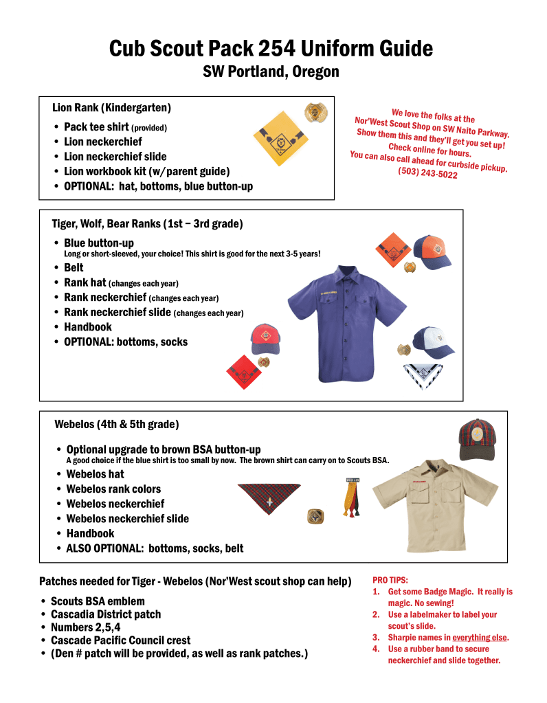 - Uniform top and neckerchief (Pack 254 and the CPC have used uniforms to pass along). Optional pieces include pants, a belt, socks, a hat, and a neckerchief slide.